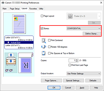 - В зависимости от условий эксплуатации использование функции Штамп (Stamp) может быть недоступно. В этом случае задайте для параметра Буферизация на драйвере принтера (Spooling at Printer Driver) в диалоговом окне Специальные настройки (Special Settings) значение Да (Yes).