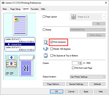 Seleccione la casilla de verificación Impresión centrada (Print Centered) en la ficha Disposición (Layout).