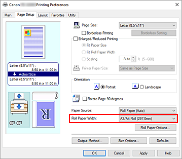 - Quando si seleziona la carta in formato ritratto come Formato pagina (Page Size) nella scheda Imposta pagina (Page Setup), se la lunghezza in direzione verticale è maggiore della larghezza selezionata in Largh. carta in rot. (Roll Paper Width), anche se viene messo un segno di spunta accanto a Ruota pagina di 90 gradi (Rotate Page 90 degrees), la pagina non viene comunque ruotata.