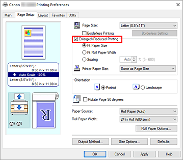 - 장치 설정(Device Settings) 탭에서 용지 공급 자동 전환(용기 크기 우선)(Automatically switch paper sources (paper size priority))을 설정하고 페이지 설정(Page Setup) 탭의 확대/축소 인쇄(Enlarged/Reduced Printing)에서 롤 용지 너비에 맞춤(Fit Roll Paper Width)을 선택하고 용지 공급(Paper Source)에서 롤 용지(자동)(Roll Paper (Auto))를 선택한 경우 확대/축소 인쇄를 수행하면 항상 롤 용지 1(상단 롤 용지)에 인쇄됩니다.