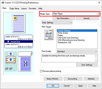 Na lista Tam. Pág. (Page Size) da guia Configurar Página (Page Setup), selecione o mesmo tamanho do documento que foi criado com o software de aplicativo.