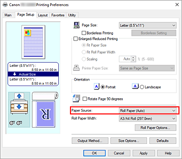 Se você selecionou papel em rolo para Origem do papel (Paper Source), defina Larg. papel em rolo (Roll Paper Width) como a largura do papel em rolo carregado na impressora.