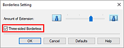 Quando a caixa de diálogo Configuração sem bordas (Borderless Setting) é exibida, insira uma marca de verificação ao lado da opção Sem bordas nos três lados (Three-sided Borderless) e clique em OK.