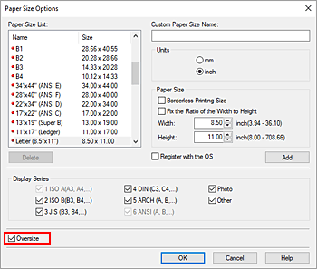 - Para definir um tamanho de papel superdimensionado para um tamanho não padrão, registre esse tamanho na caixa de diálogo Opções de tamanho do papel (Paper Size Options). Um tamanho de papel superdimensionado não pode ser definido na caixa de diálogo Configurações de tamanho personalizado (Custom Size Settings).