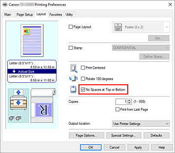 Na guia Layout, marque a caixa de seleção Sem espaç. na sup. ou inf. (No Spaces at Top or Bottom).