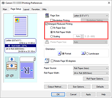 Поставьте флажок для пункта Печать с увеличением/уменьшением (Enlarged/Reduced Printing) и выберите значение По ширине рулона (Fit Roll Paper Width).