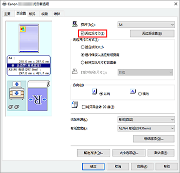 - 如果在无边距打印选项旁添加选中标记,版式选项卡中的页面排版和打印居中选项将显示为灰色且无法设置。