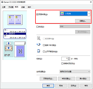 在版式选项卡上,选中页面布局复选框,然后从下拉菜单中选择2 页/张、4 页/张、6 页/张、8 页/张、9 页/张或16 页/张。