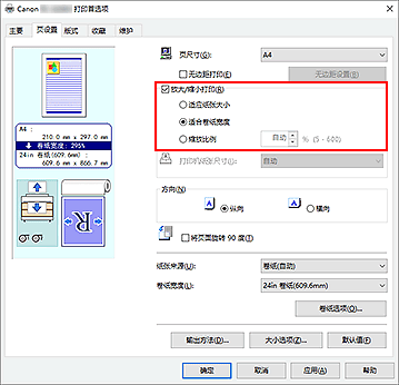 如果已在应用程序软件中设置可选尺寸,则在页尺寸的自定义纸张中选择自定义大小,然后在显示的对话框中指定尺寸。选择卷纸宽度