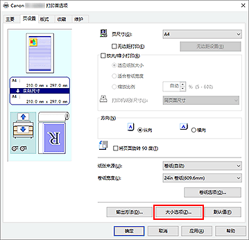 从页设置选项卡的页尺寸列表中,选择与使用应用程序软件创建的文档相同的尺寸。