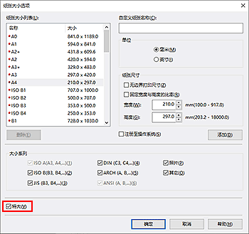 - 要为非标准纸张尺寸设置超大纸张尺寸,请在纸张大小选项对话框中注册纸张尺寸。 无法为在自定义大小设置对话框中设置的纸张尺寸设置超大纸张尺寸。