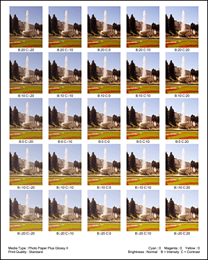 Oglejte si rezultate tiskanja in izberite sliko, ki vam je najbolj všeč. Nato v polji Gostota (Intensity) in Kontrast (Contrast) na kartici Prilagajanje barv (Color Adjustment) vnesite številke intenzivnosti/kontrasta, prikazane na dnu slike.