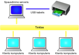 - Į spausdinimo serverį ir į kiekvieną klientą turi būti įdiegta spausdinimo tvarkyklė.