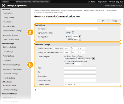 Pokud je v části [Algoritmus podpisu (Signature Algorithm)] vybrána možnost [SHA384 (SHA384)] nebo [SHA512 (SHA512)], jako délku klíče nelze vybrat [512 bitů (512-bit)], jestliže je v části [Algoritmus klíče (Key Algorithm)] vybrána možnost [RSA (RSA)].