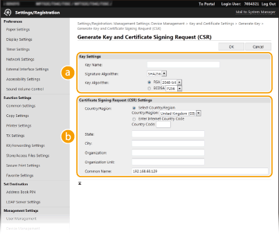 Pokud je v části [Algoritmus podpisu (Signature Algorithm)] vybrána možnost [SHA384 (SHA384)] nebo [SHA512 (SHA512)], jako délku klíče nelze vybrat [512 bitů (512-bit)], jestliže je v části [Algoritmus klíče (Key Algorithm)] vybrána možnost [RSA (RSA)].