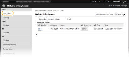 U pozastavených a zabečených dokumentů kliknutím na tlačítko [Číslo úlohy (Job Number)] zobrazíte podrobné informace. Můžete zkontrolovat uživatelské jméno a počet stránek vytištěného dokumentu.