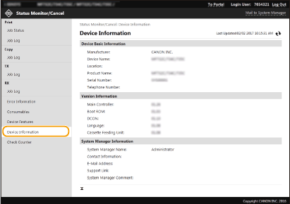 Zobrazí se informace o zařízení a správci systému. Název zařízení a další informace o správci systému zobrazené na této stránce odpovídají nastavením v části [Informace správce systému (System Manager Information)] na stránce [Správa uživatelů (User Management)] nebo v části [Nastavení informací o zařízení (Device Information Settings)] na stránce [Správa zařízení (Device Management)].