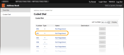Klikněte na textový odkaz v části [Číslo (Number)], [Typ (Type)] nebo [Jméno (Name)] u položky „Neuloženo (Not Registered)“.