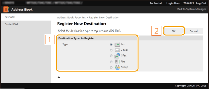 Vyberte možnost [Typ místa určení pro uložení (Destination Type to Register)] a klikněte na tlačítko [OK (OK)].