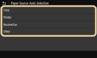 U každého zdroje papíru zapněte nebo vypněte funkci automatického výběru zdroje papíru. Je-li tato možnost nastavena na <Zap (On)>, zařízení pro každou tiskovou úlohu automaticky vybírá zdroj papíru, v němž je vložen papír příslušné velikosti. Když ve vybraném zdroji papíru dojde papír, tato funkce umožňuje plynulý tisk přepínáním z daného zdroje papíru na jiný, v němž je vložen papír stejné velikosti.