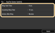 Zařízení můžete nastavit tak, aby ve stanovené lhůtě po ohlášení příchozího volání spustilo automatický příjem faxů. <Přepnout na Auto PŘ. (Switch to Auto RX)>