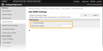 Zaškrtněte políčko [Rozlišení WINS (WINS Resolution)] a zadejte požadovaná nastavení.