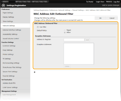 Hvis MAC-adresserne er indtastet forkert, kan du muligvis ikke få adgang til maskinen fra Fjern-UI. I dette tilfælde skal du angive <MAC-adressefilter (MAC Address Filter)> til <Fra (Off)>. <MAC-adressefilter (MAC Address Filter)>