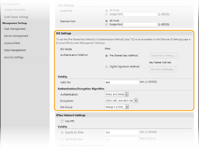 Angiv indstillingerne [Gyldig til (Valid for)] og [Autentificering (Authentication)]/[Kryptering (Encryption)]/[DH-gruppe (DH Group)].