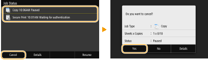 Originaler er blevet scannet og venter på at blive udskrevet. Vælg et kopidokument, der skal annulleres, og vælg <Annuller (Cancel)>
