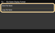 Vælg <Kort filnavn (Short File Name)> eller <Langt filnavn (Long File Name)>