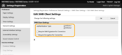 Hvis [Kræv kryptering for forbindelse (Require Encryption for Connection)] er aktiveret, kan maskinen kun oprette forbindelse til SMB-servere, som understøtter SMB v3.0 krypteret kommunikation. Selv hvis [1.0 (1.0)] og [2.0 (2.0)] er valgt for [Angivne SMB-klientversioner (Specified SMB Client Versions)], og [3.0 (3.0)] ikke er valgt, kan maskinen ikke oprette forbindelse til SMB-servere, der ikke understøtter SMB v3.0 krypteret kommunikation.