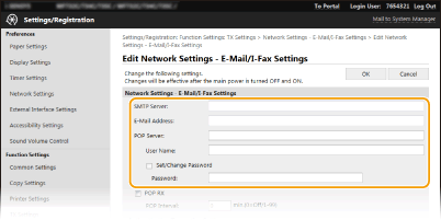 Brug Fjern-UI til at konfigurere de detaljerede indstillinger for afsendelse og modtagelse, f.eks. indstillingerne for brug af maskinen til at afsende og modtage I-faxer og indstillingerne for POP-godkendelse og kryptering af kommunikation, inden du sender e-mail eller I-faxer. Kontakt din udbyder eller netværksadministrator vedrørende de krævede indstillinger.