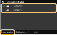 Aktivieren Sie das Kontrollkästchen für den zu löschenden Empfänger, und wählen Sie <Aus Empf. entf. (Remove from Dest.)>.
