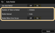 Legt das Intervall zwischen Wahlwiederholungen fest. Geben Sie eine Nummer für das Intervall ein, und wählen Sie <Anwenden (Apply)>.