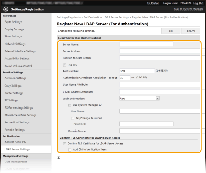 Die LDAP-Server-Registrierung muss separat entweder für die Suche oder für die Authentifizierung durchgeführt werden. Um einen LDAP-Server für die Suche nach Fax- und E-Mail-Zielen zu verwenden, registrieren Sie ihn für die Suche, und um ihn zum Authentifizieren des Versendens von E-Mails oder Faxen zu verwenden, registrieren Sie ihn für die Authentifizierung.