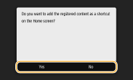 Jos valitset <Kyllä (Yes)>, näyttöön tulee viesti. Tarkista viesti ja valitse <OK (OK)>. Tallennettu asetusyhdistelmä lisätään Koti (Home)-näyttöön pikavalintapainikkeeksi.