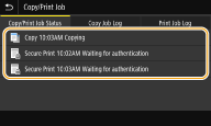 Valitse asiakirja, jonka tilan haluat tarkistaa, <Kopiointi-/tul.työn tila (Copy/Print Job Status)> ‑välilehdestä.