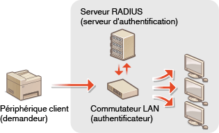 L'appareil peut se connecter à un réseau 802.1X en tant que périphérique client. Un réseau 802.1X classique se compose d'un serveur RADIUS (serveur d'authentification), d'un commutateur LAN (authentificateur) et des périphériques clients équipés du logiciel d'authentification (demandeur). Lorsqu'un périphérique essaie de se connecter au réseau 802.1X, il est tenu de s'identifier pour s'assurer que la connexion est établie par un utilisateur autorisé. Les informations d'authentification sont transmises à un serveur RADIUS pour vérification, lequel se charge d'accepter ou de refuser la communication avec le réseau selon les résultats de l'authentification. En cas d'échec de l'authentification, un commutateur LAN (ou point d'accès réseau) bloque l'accès depuis l'extérieur du réseau.