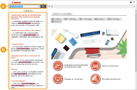 pour afficher la fenêtre de recherche. Elle contient une zone de texte pour réaliser des recherches par mot-clé et accéder à la page qui vous intéresse.