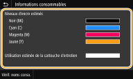 Vous pouvez vérifier la quantité d'encre restante estimée, l'espace utilisé estimé dans la cartouche d'entretien et l'utilisation de la tête d'impression au moyen de la procédure ci-dessous.