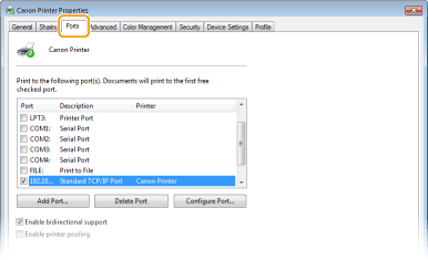 Ha hálózati kapcsolatot használ, és megváltoztatta a készülék IP-címétHa a kiválasztott port [Leírás (Description)] mezőjében a [Canon MFNP Port (Canon MFNP Port)] szerepel, a készülék és a számítógép pedig ugyanazon az alhálózaton van, akkor a kapcsolatot a rendszer fenn fogja tartani. Nem kell új portot hozzáadnia. Ha a mező értéke [Szabványos TCP/IP-port (Standard TCP/IP Port)], akkor új portot kell hozzáadnia. Nyomtatóportok konfigurálása