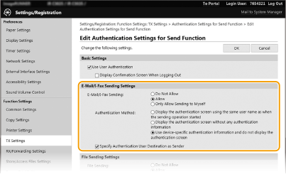 [Impostazioni autenticazione per funzione Invio (Authentication Settings for Send Function)].