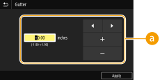 Specificare la direzione di spostamento della posizione di stampa e l'ampiezza dello spostamento. A seconda che il valore dell'impostazione sia "+" o "-" si definisce il bordo di rilegatura lungo il quale regolare il margine di rilegatura. È possibile regolare il margine di rilegatura con incrementi di 0,5 mm (0,01 pollici).