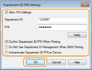 Steeds wanneer u afdrukt of faxt vanaf een computer, moet u het selectievakje voor het weergeven van het uitklapscherm [Afdelings-id en pincode bevestigen. (Confirm Department ID and PIN.)] inschakelen.