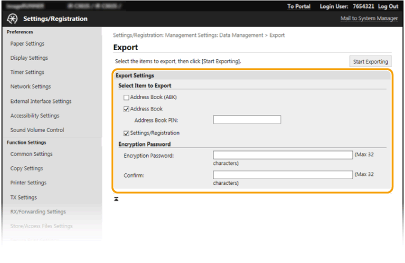 Als het [Adresboek (ABK) (Address Book(ABK))] selectievakje is geselecteerd, kunt u de instellingen van het apparaat niet tegelijkertijd met de adresboekgegevens exporteren.