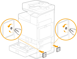 Gire os parafusos que fixam a máquina e a cassette feeding unit e remova a tampa da base.