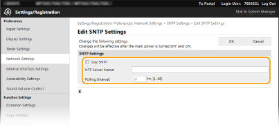 Testovanie komunikácie so serverom NTP/SNTPStav komunikácie s uloženým serverom môžete zobraziť kliknutím na položky [Settings/Registration]