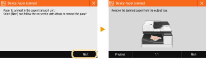 I vissa fall visas anvisningar om hur du ska åtgärda felet. Följ anvisningarna på skärmen för att lösa problemet. Skärmen som visas när ett pappersstopp inträffar visas nedan som ett exempel.