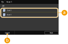 Om du använder <N på 1 (N on 1)> minskas reproförhållandet automatiskt (reproförhållandet visas på skärmen). Innan kopieringen startar kan du minska storleken ytterligare genom att minska siffervärdet som visas automatiskt. Om du ökar värdet kopieras dock inte alltid kanterna på originalet.