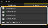 Välj dokumentet vars logg ska kontrolleras på fliken <Logg för sändningsjobb (TX Job Log)>.
